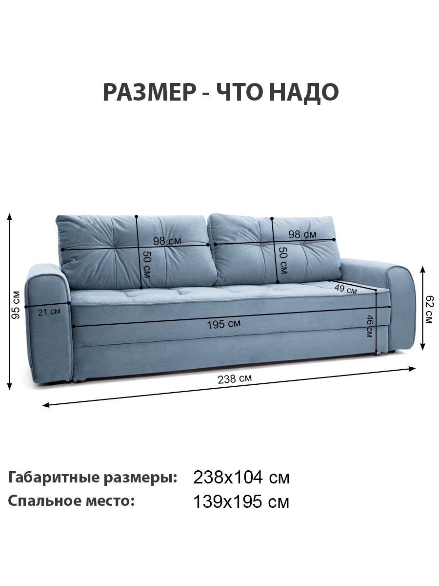 особенности: высота спинки от пола (без подушек) 74 см, глубина сиденья до подушек 49 см, без подушек 76 см, СПИНКА: ширина (толщина) 21 см, высота от сиденья 29 см, высота спинки от пола 85 см, ПОДЛОКОТНИК: ширина 21 см, длина 102 см, высота от пола 62 см, подушки: большие 98х50 см, маленькие 35х35 см, высота опор (ножек) 3,5 см