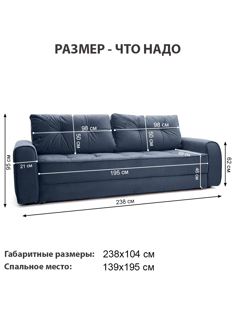 особенности: высота спинки от пола (без подушек) 74 см, глубина сиденья до подушек 49 см, без подушек 76 см, СПИНКА: ширина (толщина) 21 см, высота от сиденья 29 см, высота спинки от пола 85 см, ПОДЛОКОТНИК: ширина 21 см, длина 102 см, высота от пола 62 см, подушки: большие 98х50 см, маленькие 35х35 см, высота опор (ножек) 3,5 см