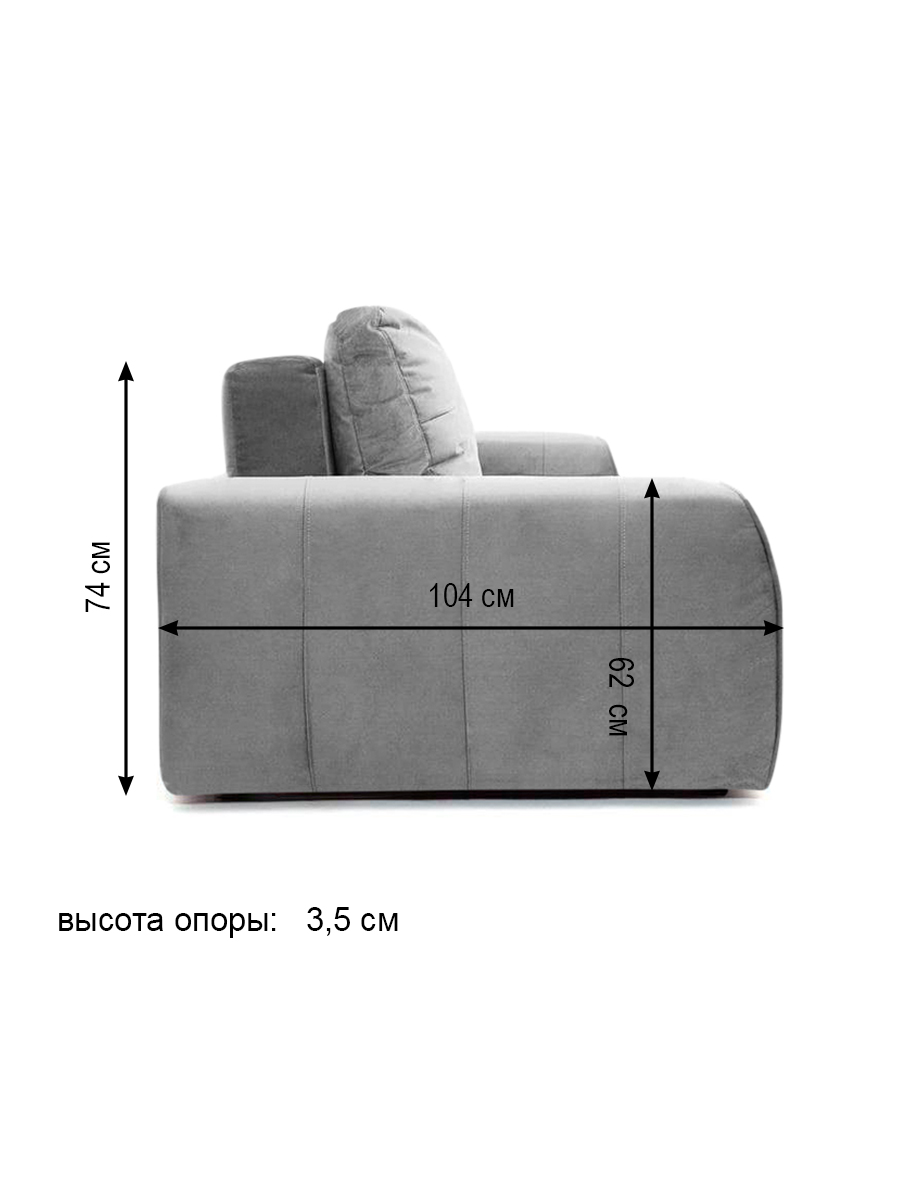 особенности: высота спинки от пола (без подушек) 74 см, глубина сиденья до подушек 49 см, без подушек 76 см, СПИНКА: ширина (толщина) 21 см, высота от сиденья 29 см, высота спинки от пола 85 см, ПОДЛОКОТНИК: ширина 21 см, длина 102 см, высота от пола 62 см, подушки: большие 98х50 см, маленькие 35х35 см, высота опор (ножек) 3,5 см