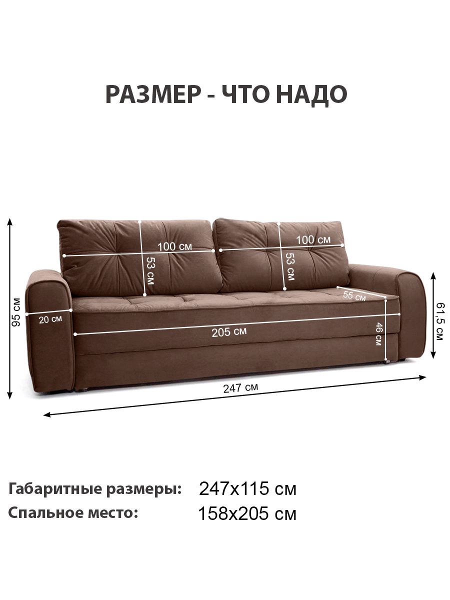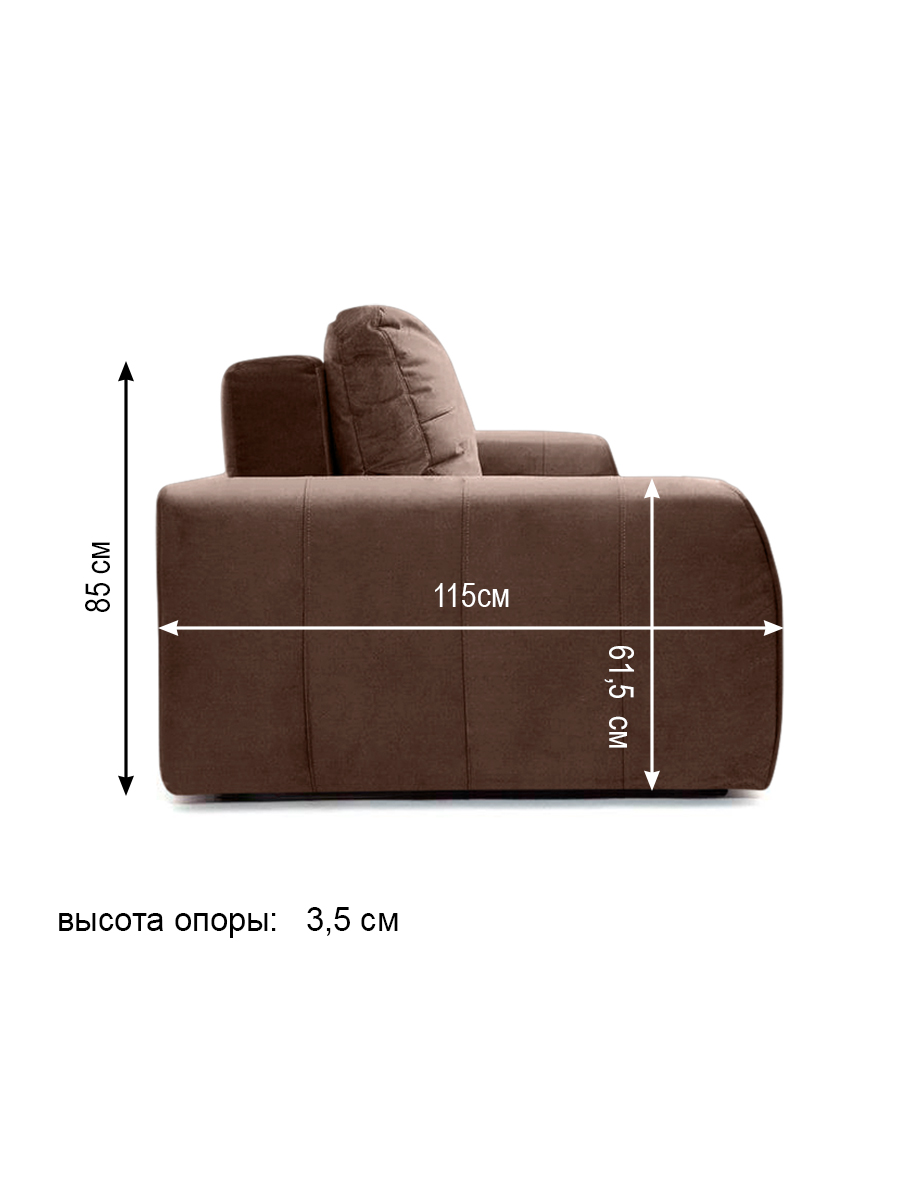 особенности: высота спального места 46 см, высота спинки от пола (без подушек) 85 см, глубина сиденья до подушек 55 см, без подушек 85 см, СПИНКА: ширина (толщина) 20 см, высота от сиденья 40 см, ПОДЛОКОТНИК: ширина 20 см, длина 113 см, высота от пола 61,5 см, подушки: большие 100х53 см, маленькие 35х35 см, высота опор (ножек) 3,5 см.