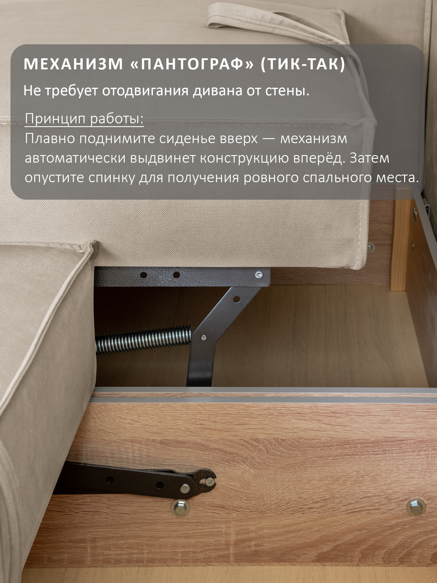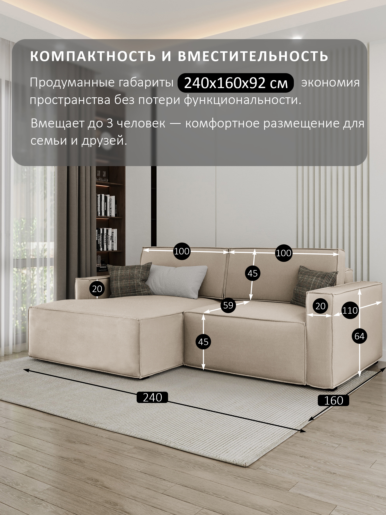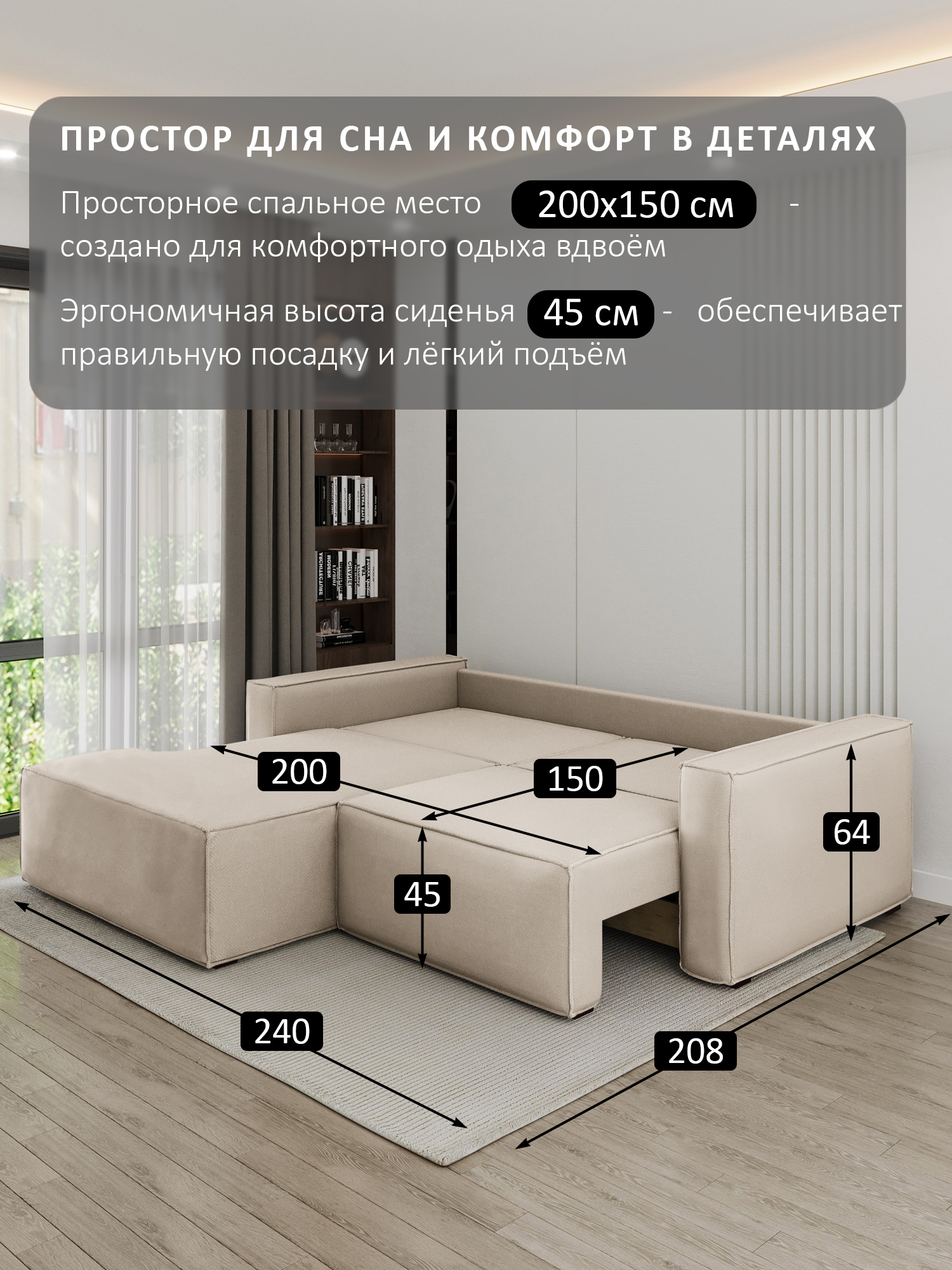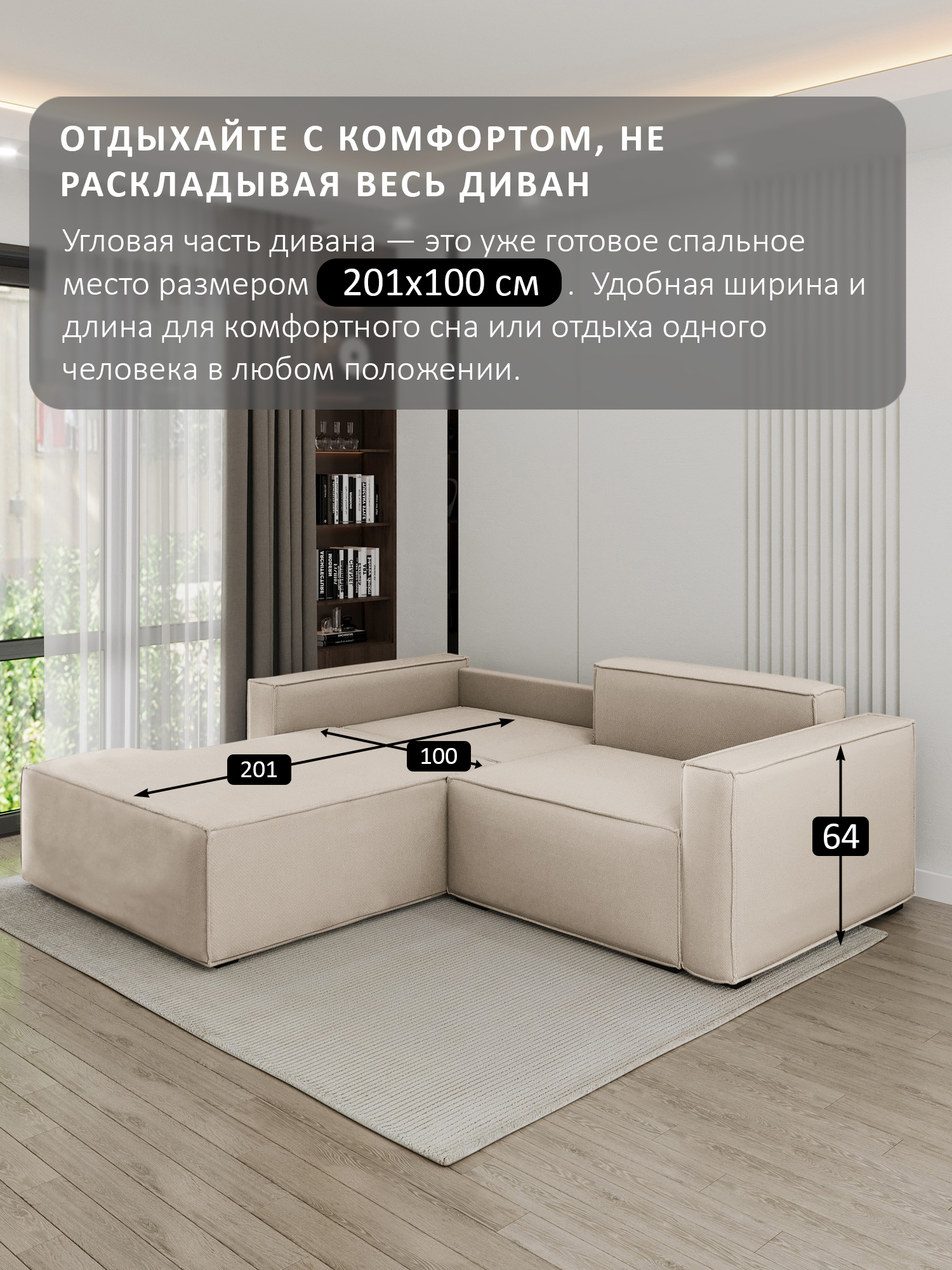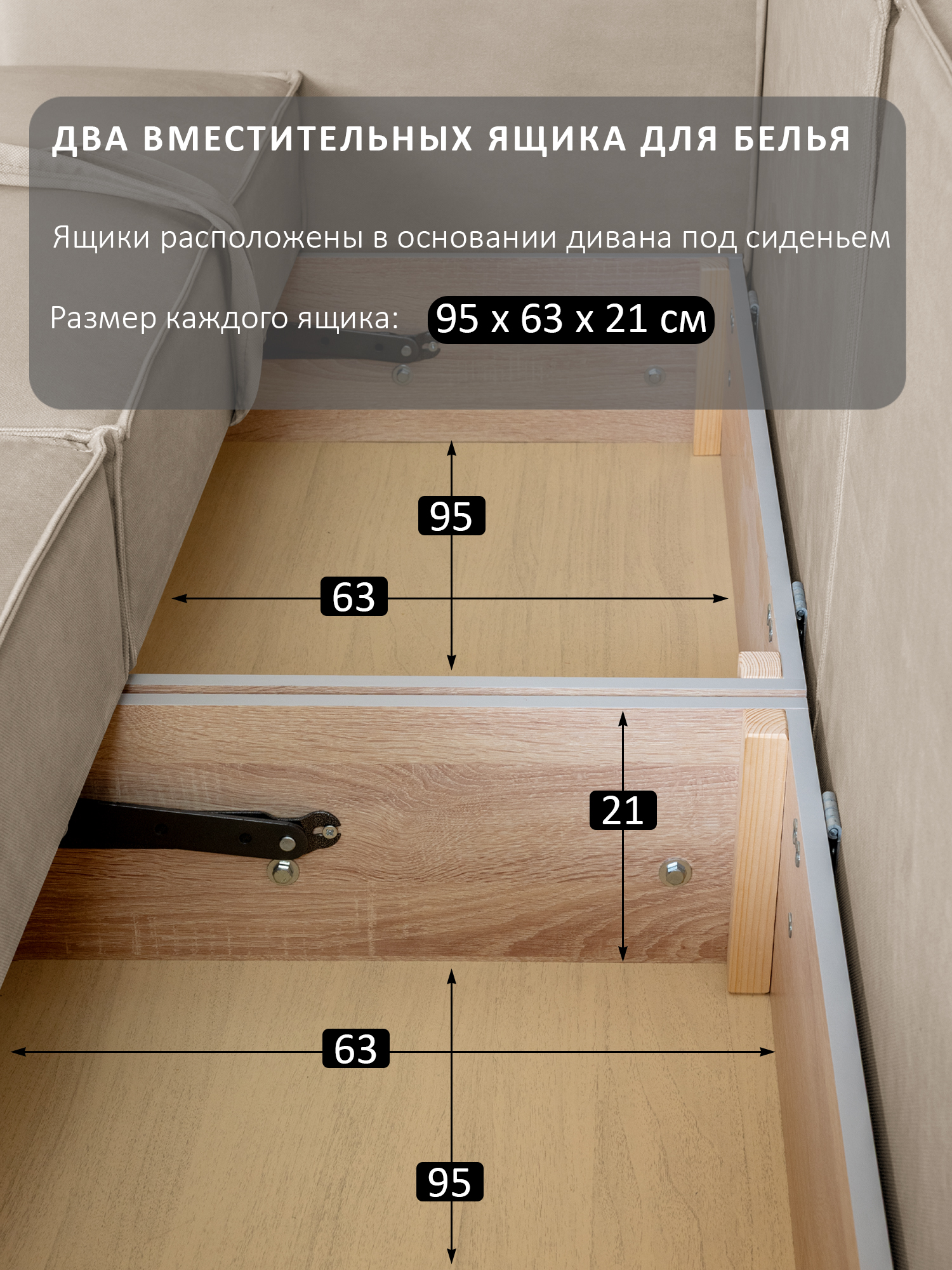особенности: высота сиденья от пола 45см, глубина сиденья до подушек 59см, без подушек 80см, ящики 2 штуки, размер каждого 95х63х21, ширина спинки (толщина) 28см (21см спинка – вторая половина спального места + 7см фальшспинка), ширина подлокотника 20 см, длина 110см высота подлокотника от пола 64см, от сиденья – 20см, подушки: 100х45, толщина: верх 15см, низ 21см, высота ножек (опор) 3,5см, глубина оттоманки (тахты) в разложенном виде 201 см