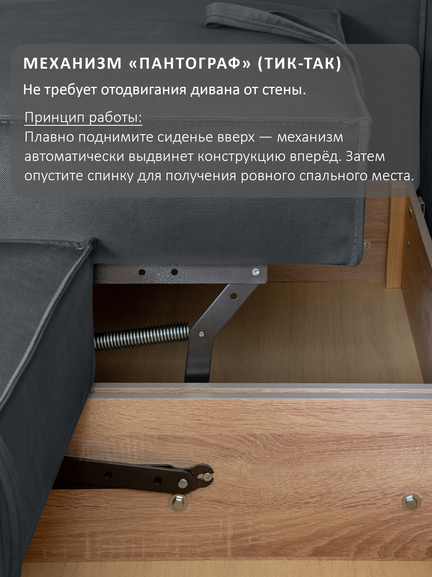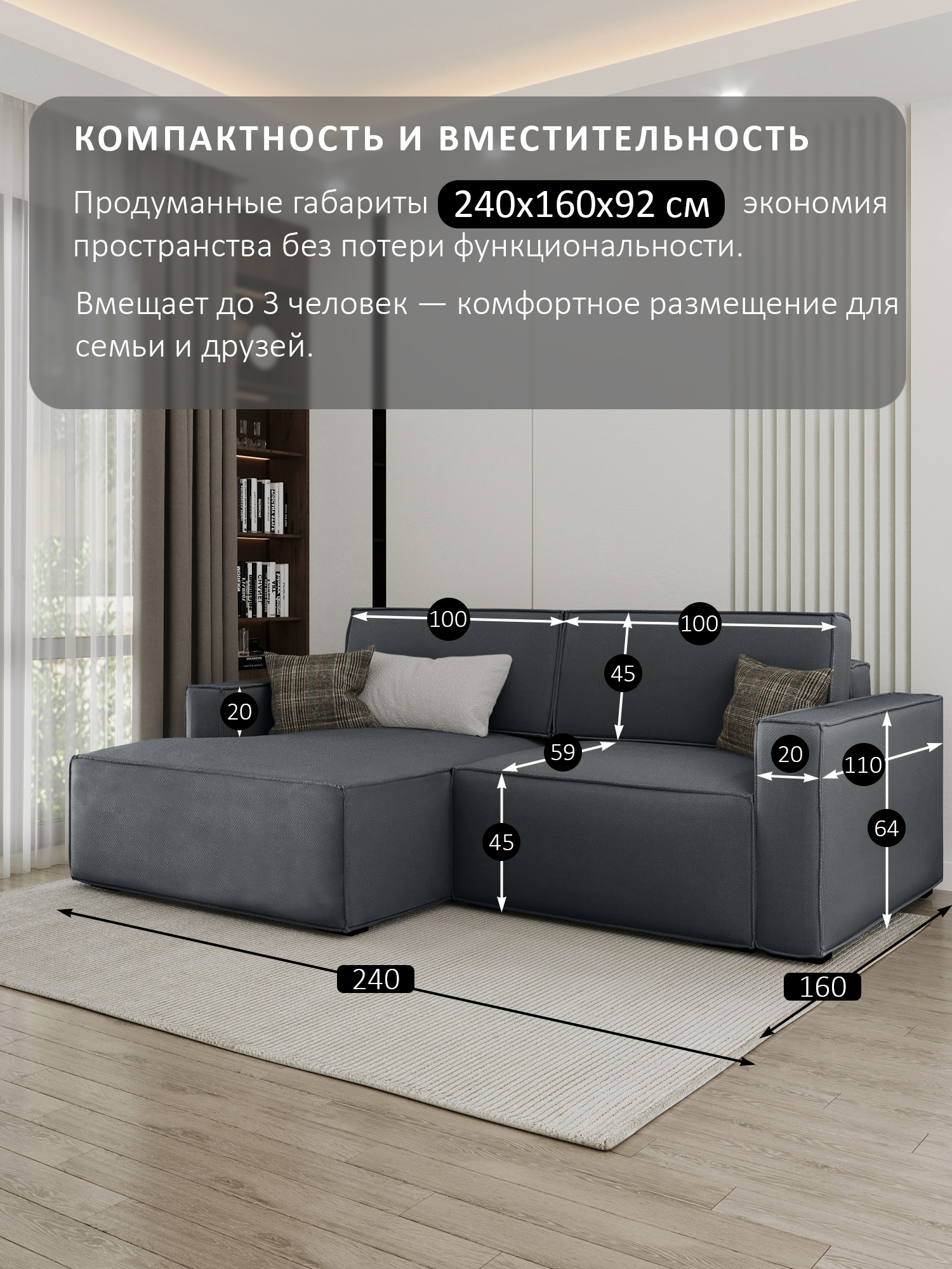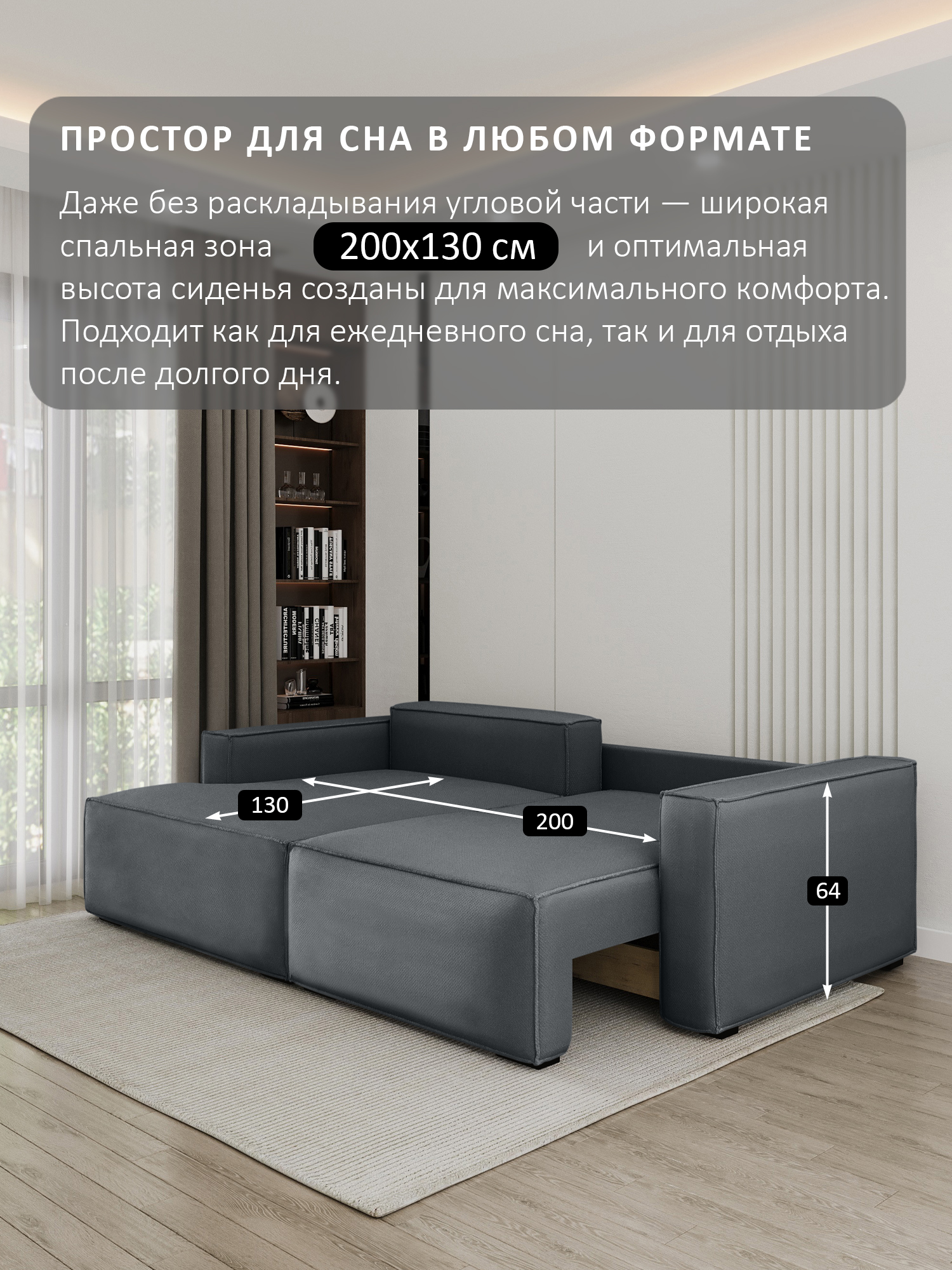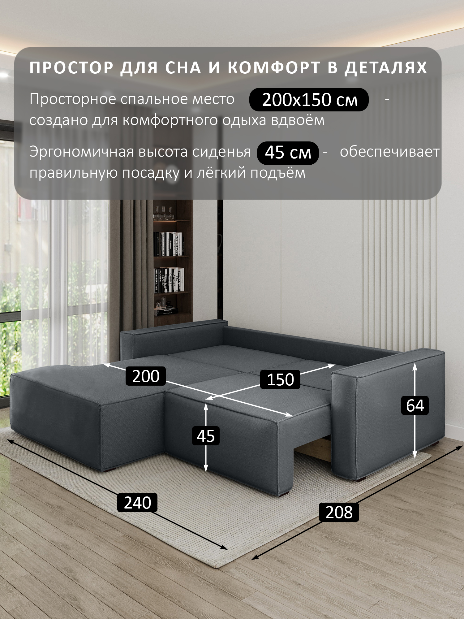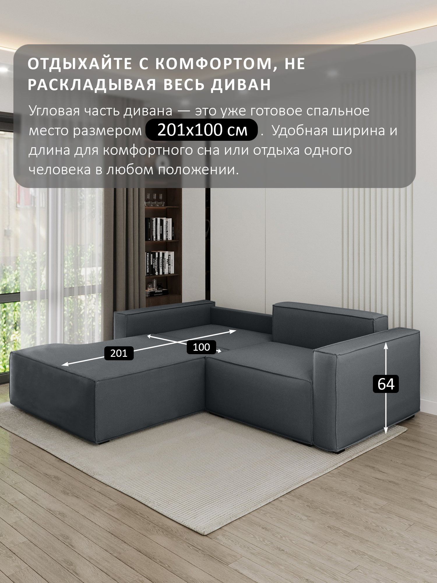 особенности: высота сиденья от пола 45см, глубина сиденья до подушек 59см, без подушек 80см, ящики 2 штуки, размер каждого 95х63х21, ширина спинки (толщина) 28см (21см спинка – вторая половина спального места + 7см фальшспинка), ширина подлокотника 20 см, длина 110см высота подлокотника от пола 64см, от сиденья – 20см, подушки: 100х45, толщина: верх 15см, низ 21см, высота ножек (опор) 3,5см, глубина оттоманки (тахты) в разложенном виде 201 см