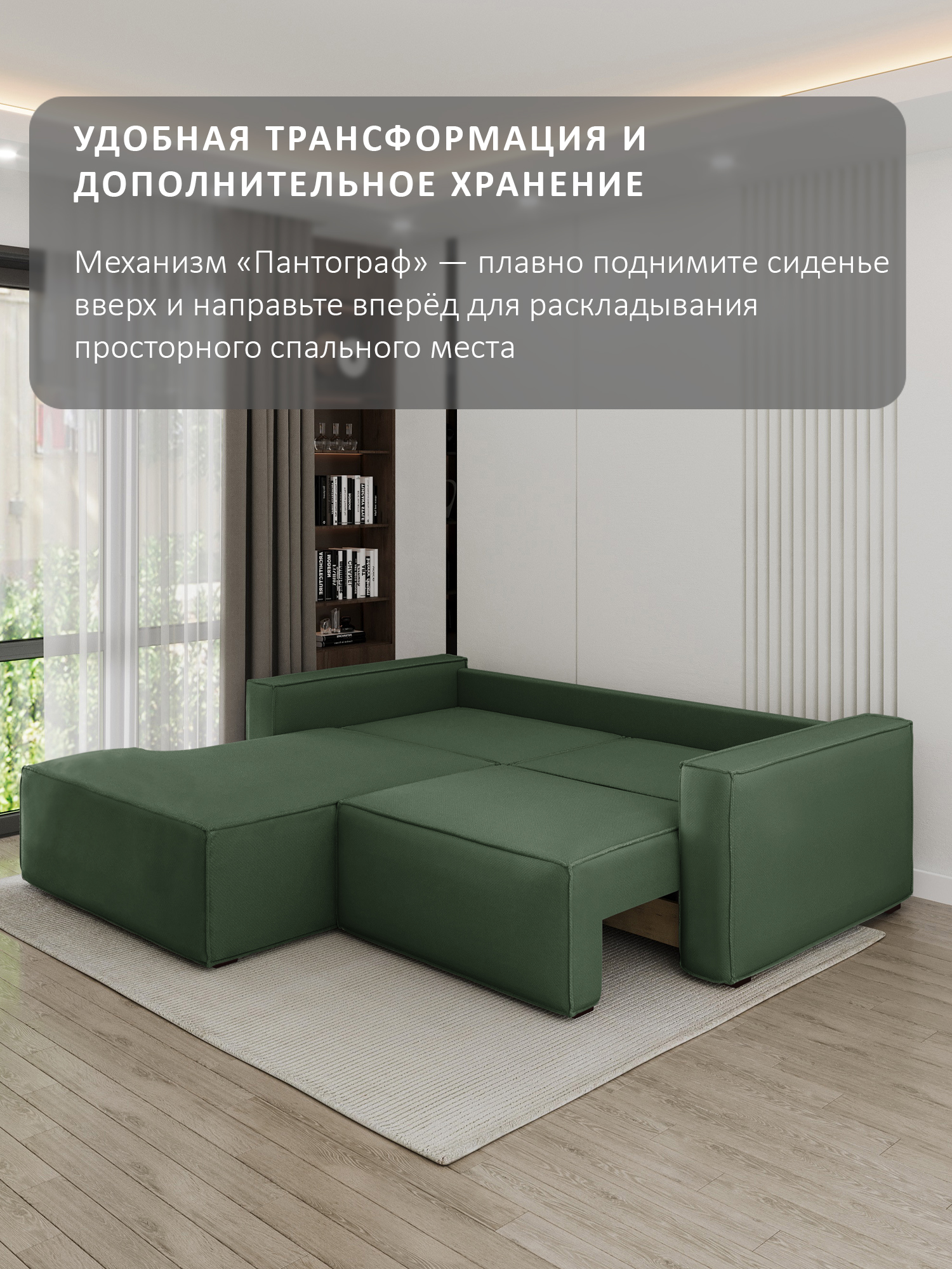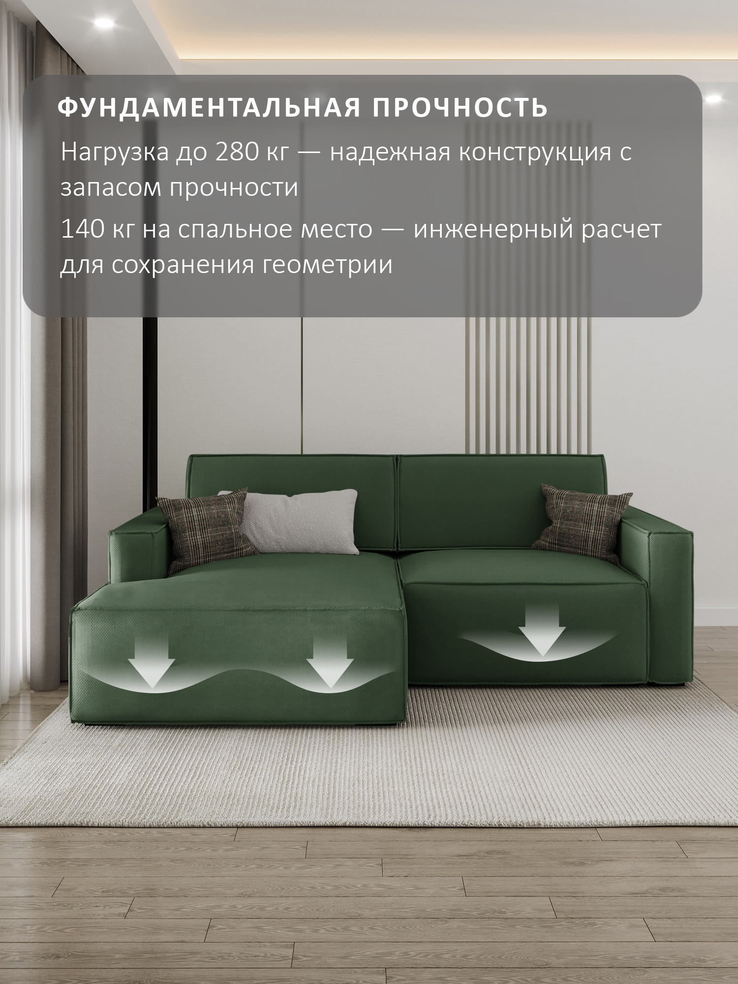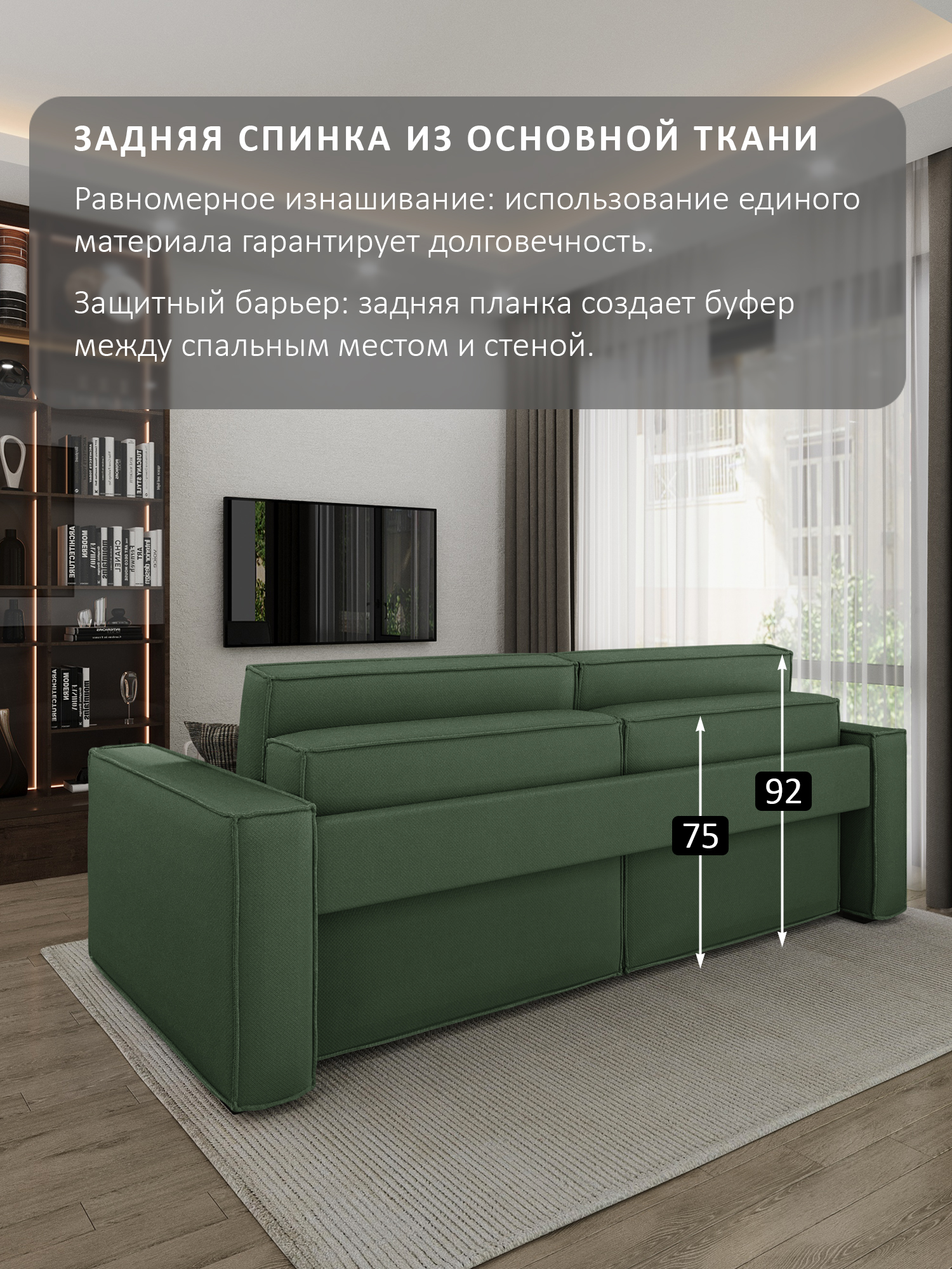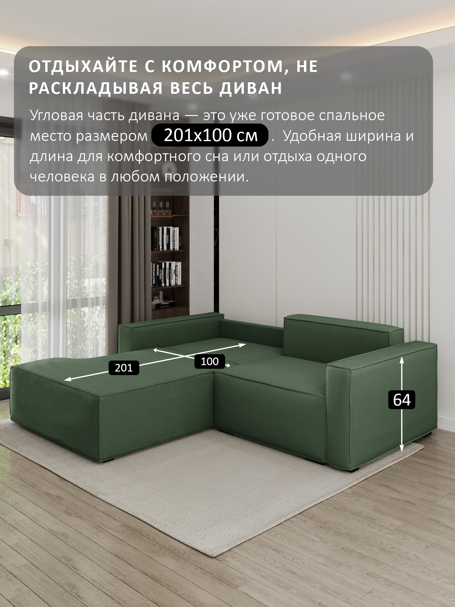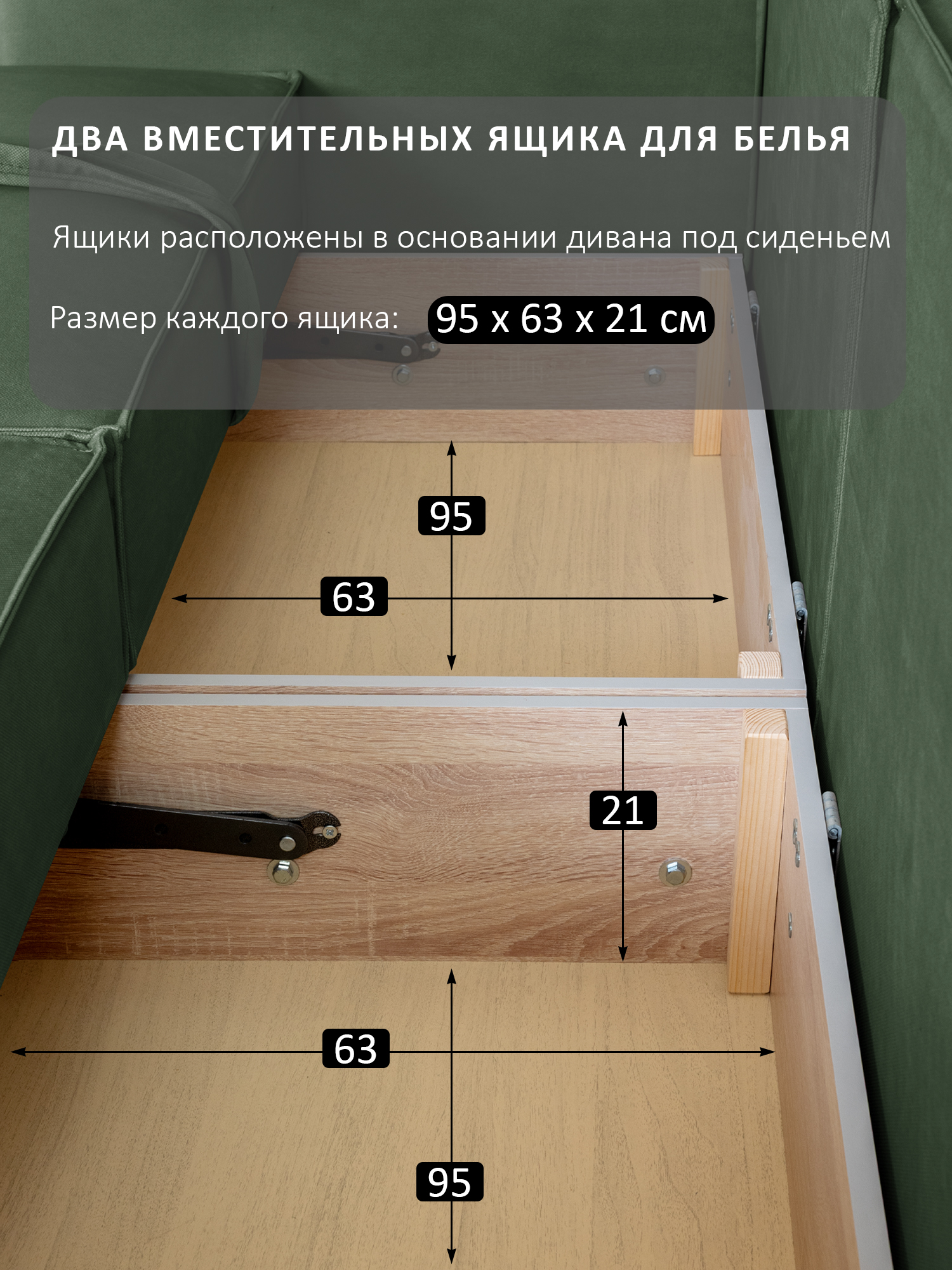 особенности: высота сиденья от пола 45см, глубина сиденья до подушек 59см, без подушек 80см, ящики 2 штуки, размер каждого 95х63х21, ширина спинки (толщина) 28см (21см спинка – вторая половина спального места + 7см фальшспинка), ширина подлокотника 20 см, длина 110см высота подлокотника от пола 64см, от сиденья – 20см, подушки: 100х45, толщина: верх 15см, низ 21см, высота ножек (опор) 3,5см, глубина оттоманки (тахты) в разложенном виде 201 см