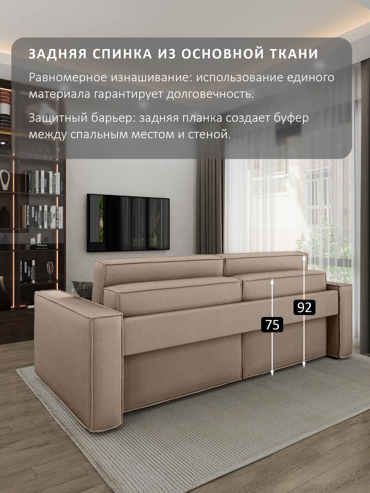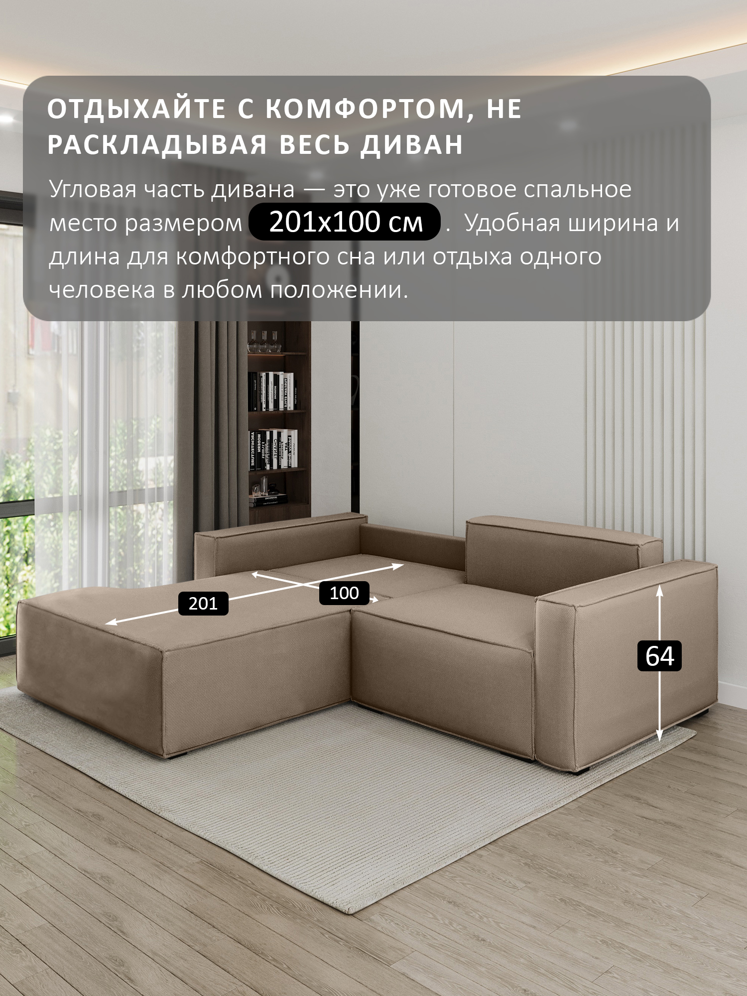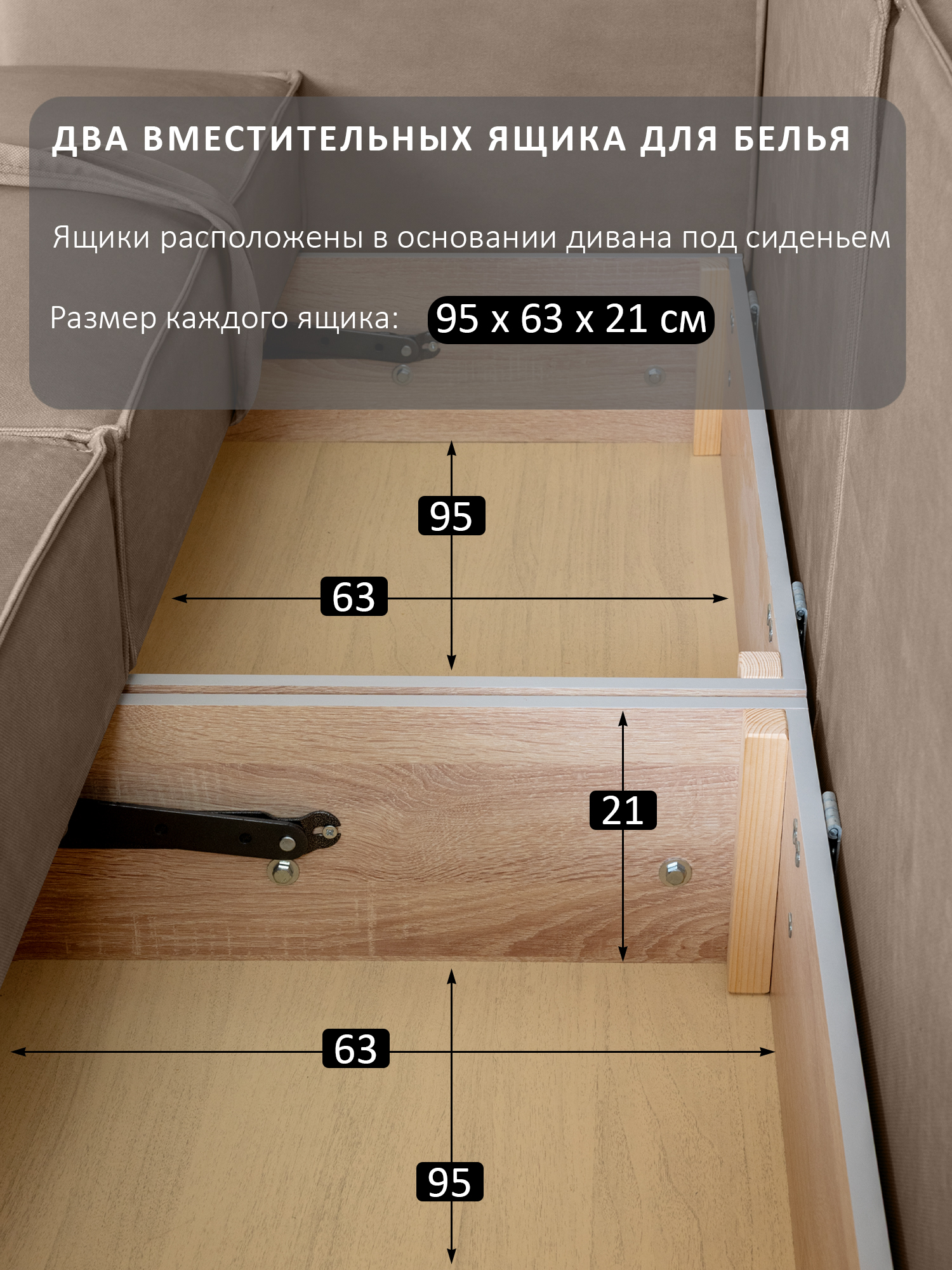 особенности: высота сиденья от пола 45см, глубина сиденья до подушек 59см, без подушек 80см, ящики 2 штуки, размер каждого 95х63х21, ширина спинки (толщина) 28см (21см спинка – вторая половина спального места + 7см фальшспинка), ширина подлокотника 20 см, длина 110см высота подлокотника от пола 64см, от сиденья – 20см, подушки: 100х45, толщина: верх 15см, низ 21см, высота ножек (опор) 3,5см, глубина оттоманки (тахты) в разложенном виде 201 см