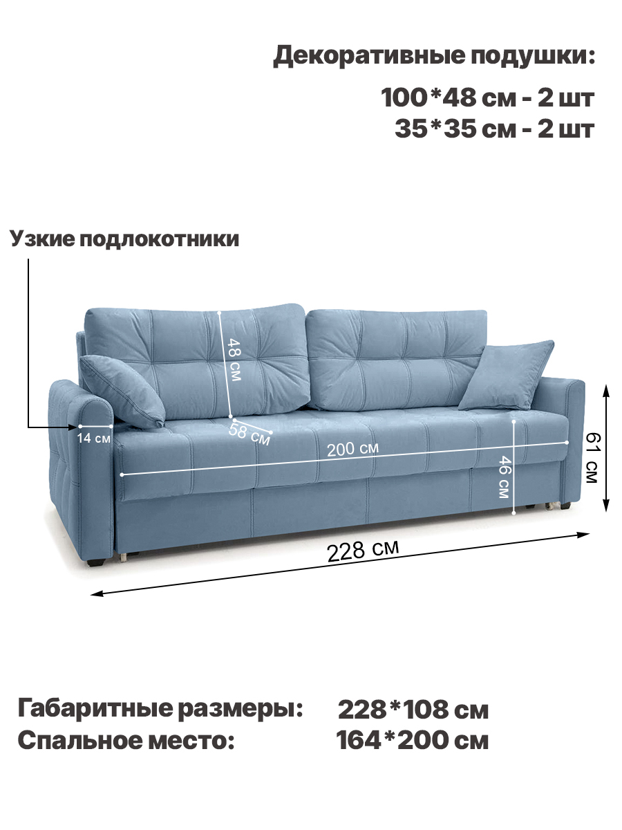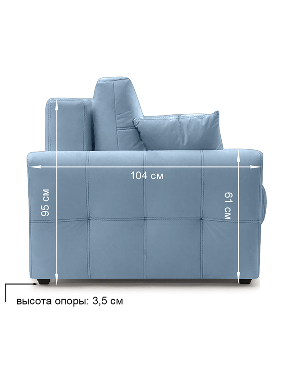 особенности: высота спального места 45 см, глубина до подушек 58 см, глубина без подушек 82 см, высота опор (ножек) 3,5 см, глубина спинки 21 см, высота спинки от пола 85 см, высота спинки от сидения 40 см, ширина подлокотника 14 см, глубина подлокотника 104 см, высота подлокотника от пола 61 см