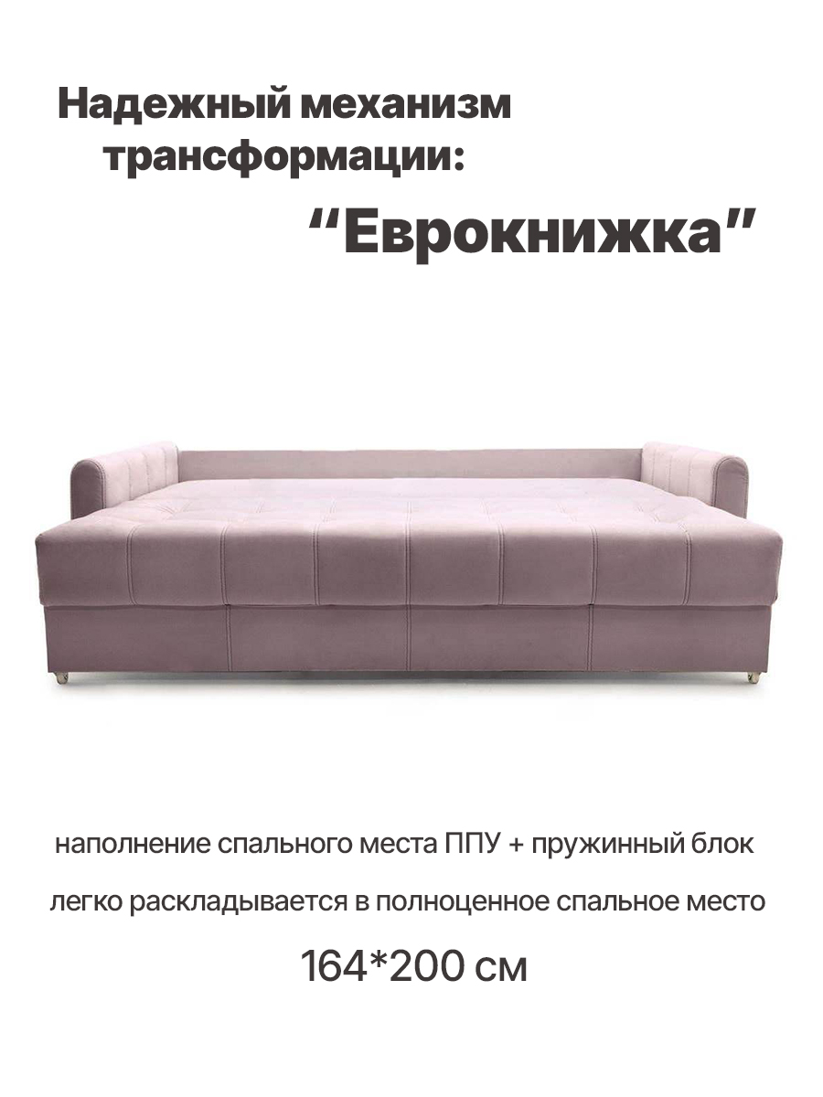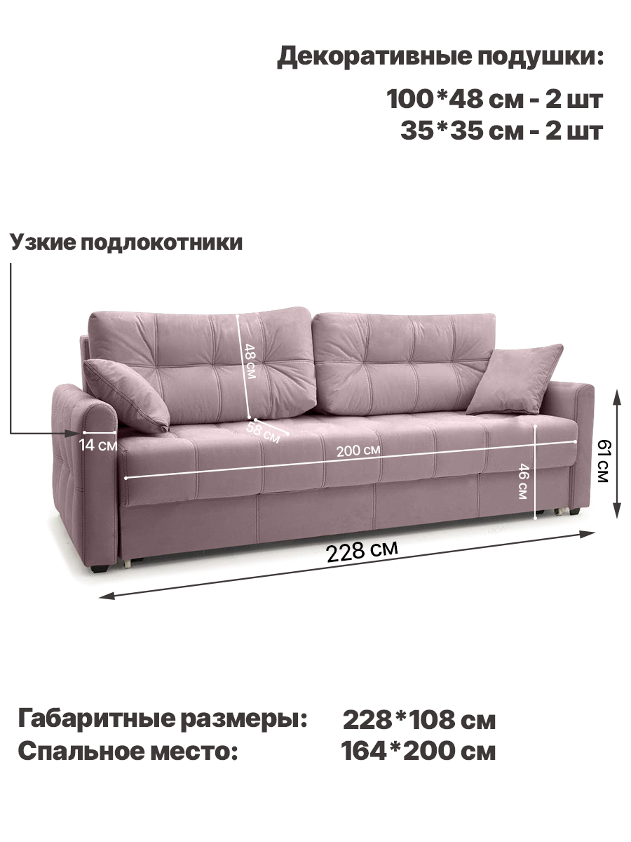 особенности: высота спального места 45 см, глубина до подушек 58 см, глубина без подушек 82 см, высота опор (ножек) 3,5 см, глубина спинки 21 см, высота спинки от пола 85 см, высота спинки от сидения 40 см, ширина подлокотника 14 см, глубина подлокотника 104 см, высота подлокотника от пола 61 см