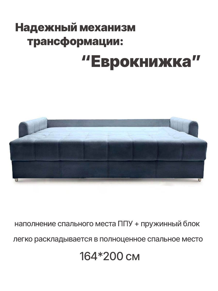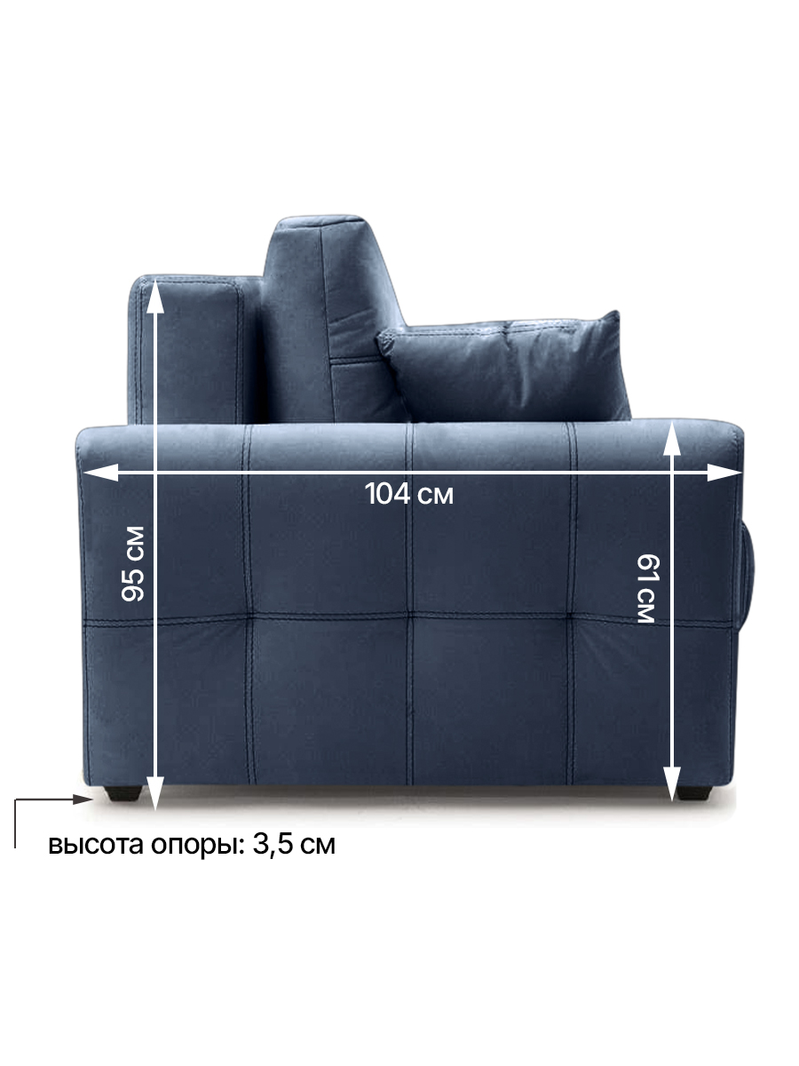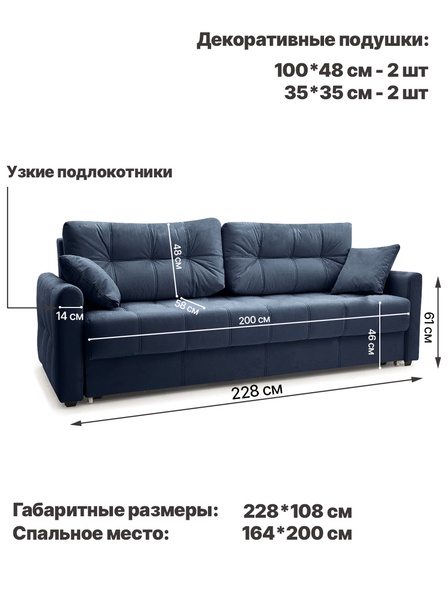 особенности: высота спального места 45 см, глубина до подушек 58 см, глубина без подушек 82 см, высота опор (ножек) 3,5 см, глубина спинки 21 см, высота спинки от пола 85 см, высота спинки от сидения 40 см, ширина подлокотника 14 см, глубина подлокотника 104 см, высота подлокотника от пола 61 см