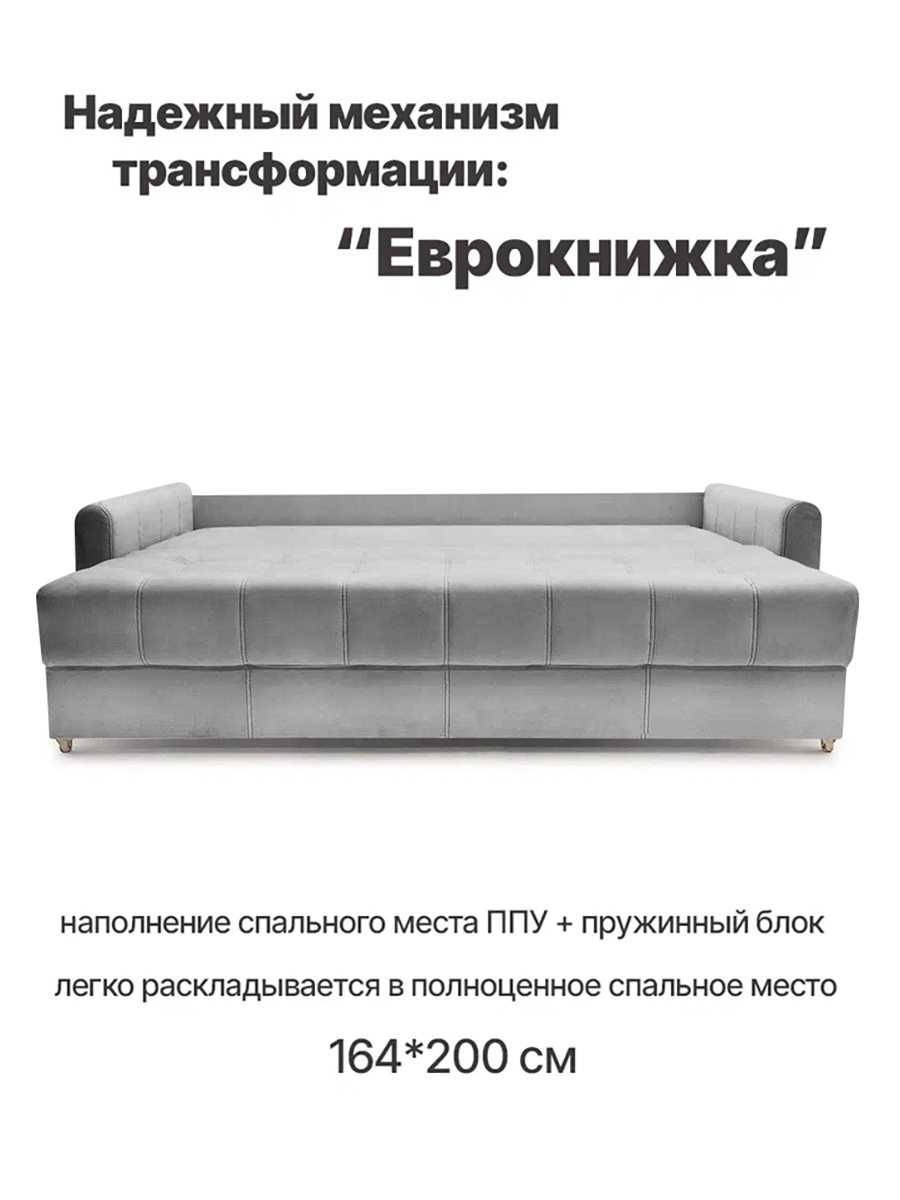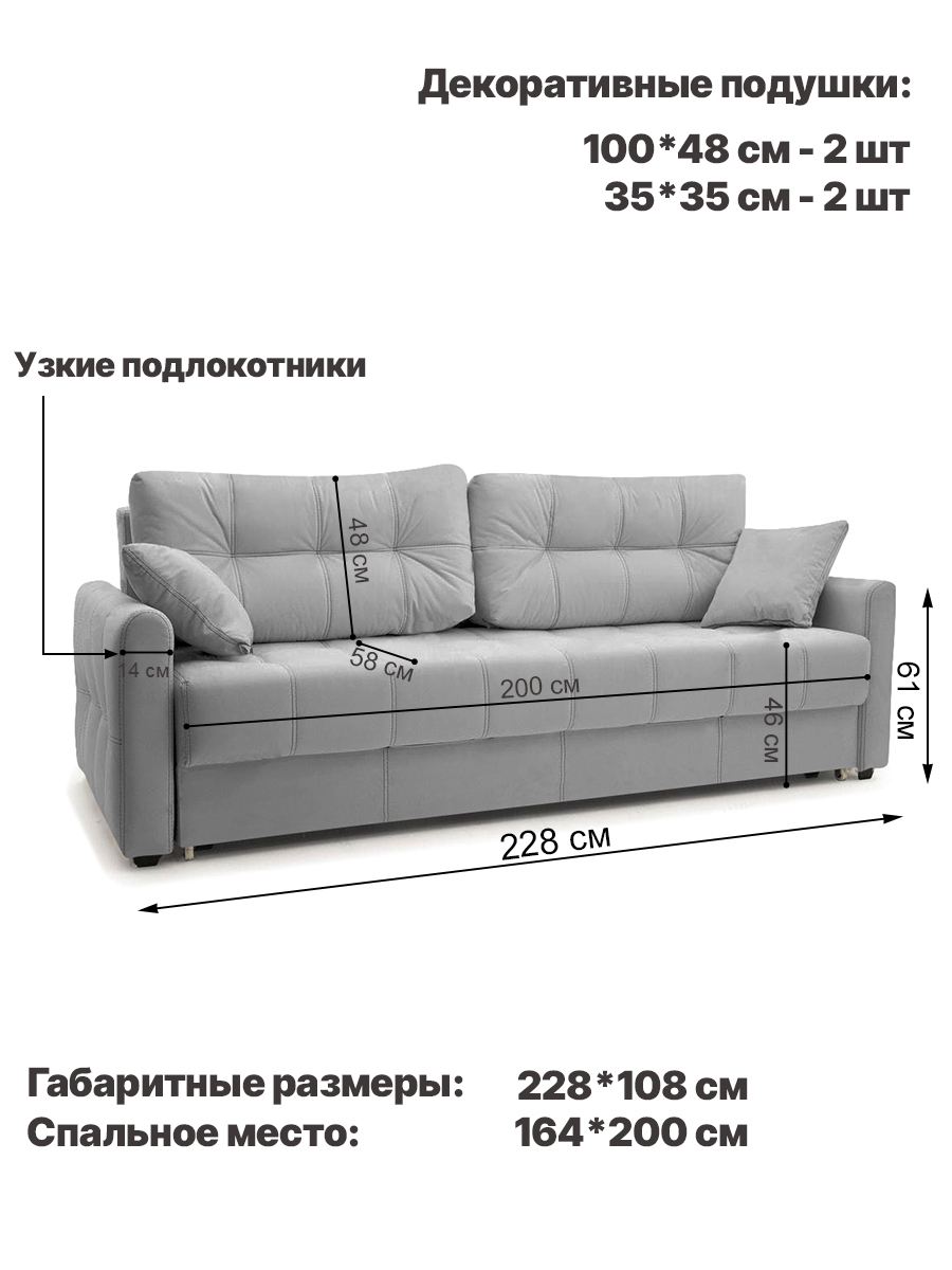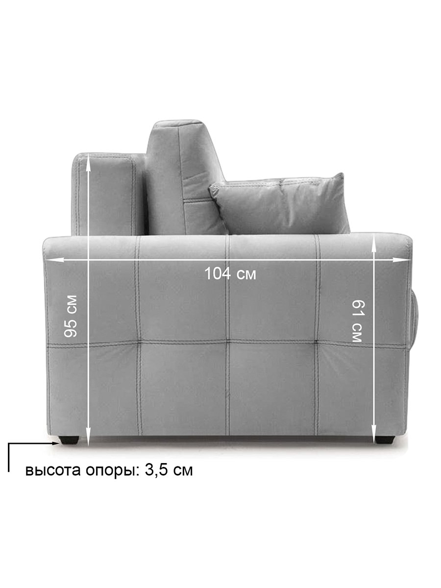 особенности: высота спального места 45 см, глубина до подушек 58 см, глубина без подушек 82 см, высота опор (ножек) 3,5 см, глубина спинки 21 см, высота спинки от пола 85 см, высота спинки от сидения 40 см, ширина подлокотника 14 см, глубина подлокотника 104 см, высота подлокотника от пола 61 см