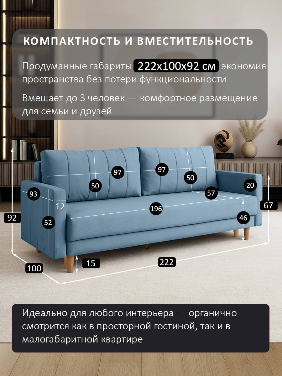 особенности: Высота подушек от сидения: 50 см, ширина каждой подушки 97 см, высота подлокотника от пола 67 см, высота подлокотника от сидения: 20 см, глубина сидения до подушки 57 см, глубина подлокотника 93 см, ширина подлокотника 12 см, высота опор 15 см.