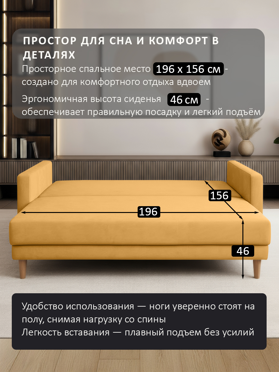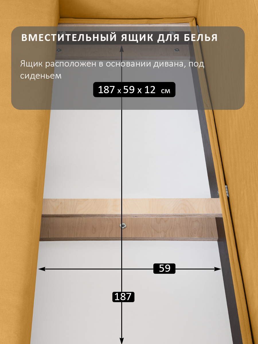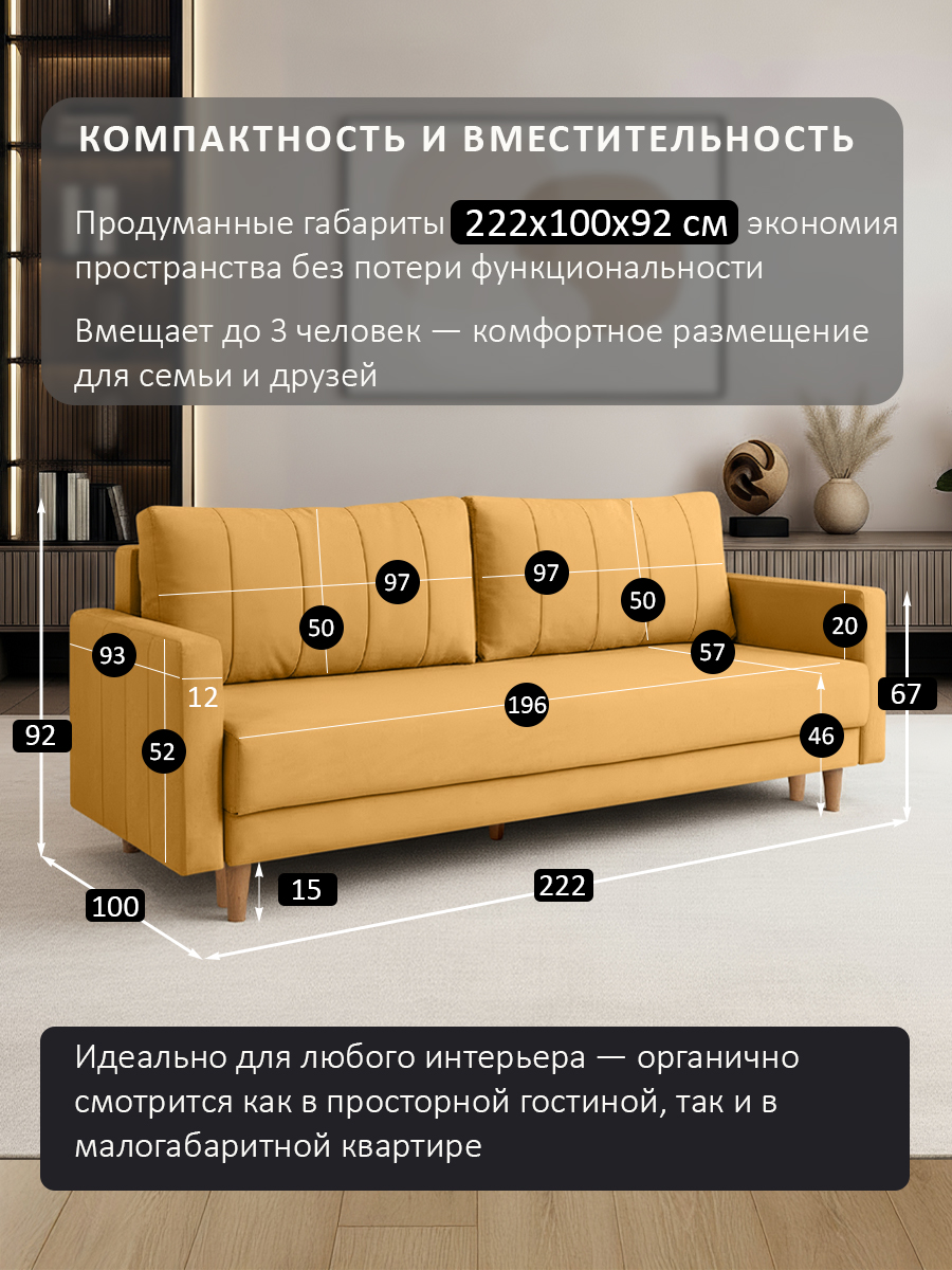 особенности: Высота подушек от сидения: 50 см, ширина каждой подушки 97 см, высота подлокотника от пола 67 см, высота подлокотника от сидения: 20 см, глубина сидения до подушки 57 см, глубина подлокотника 93 см, ширина подлокотника 12 см, высота опор 15 см.