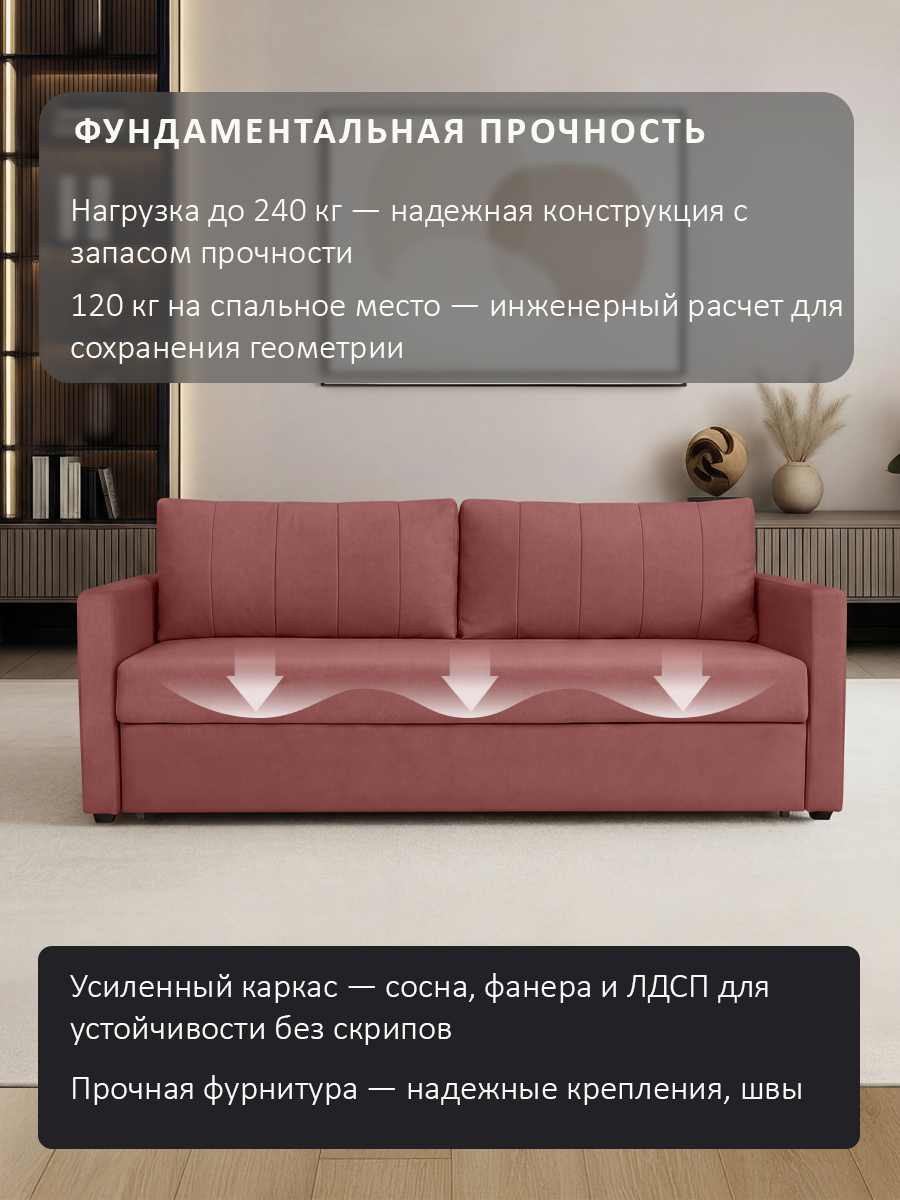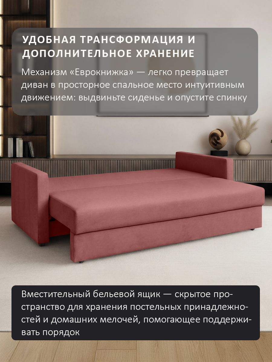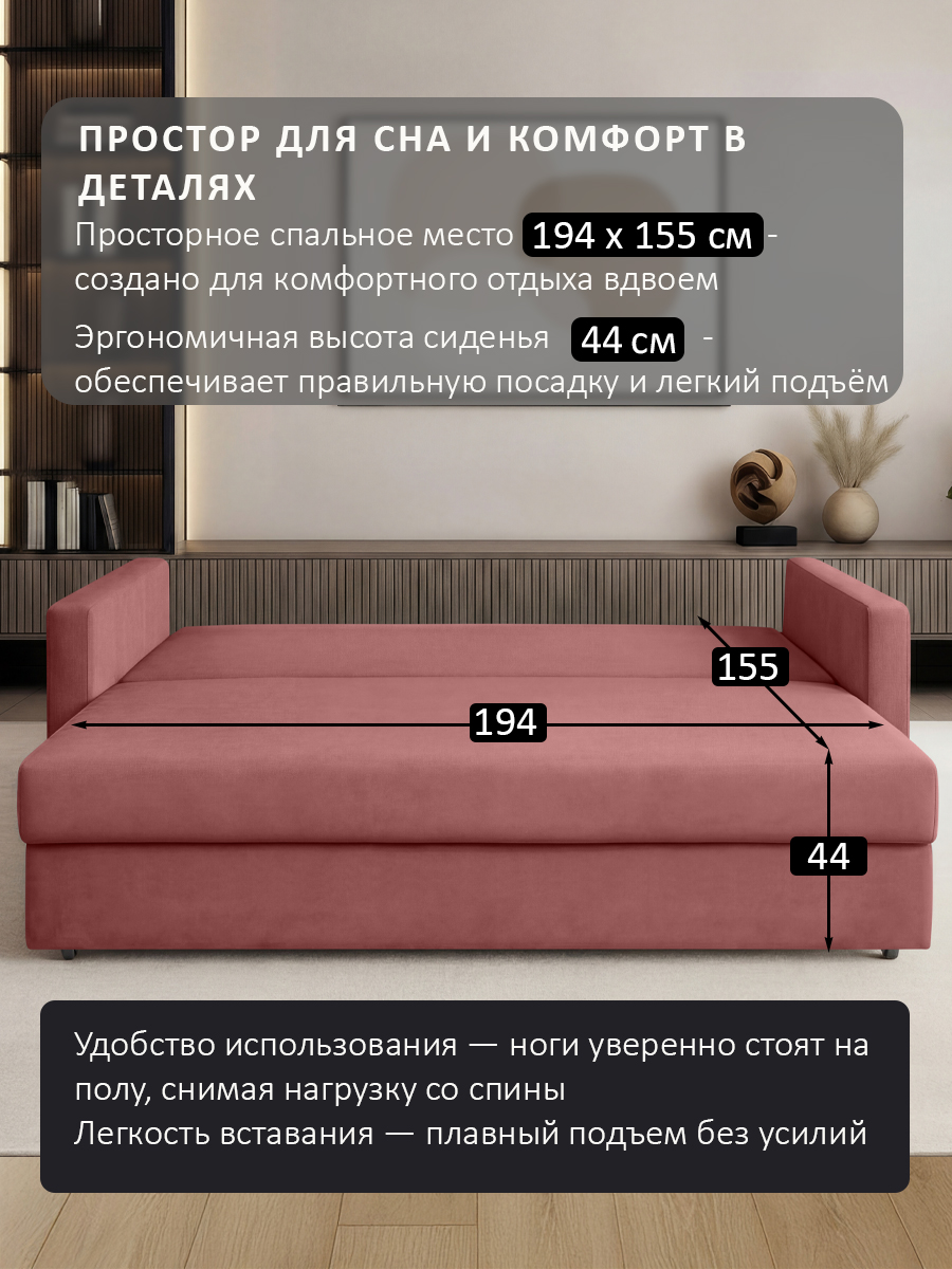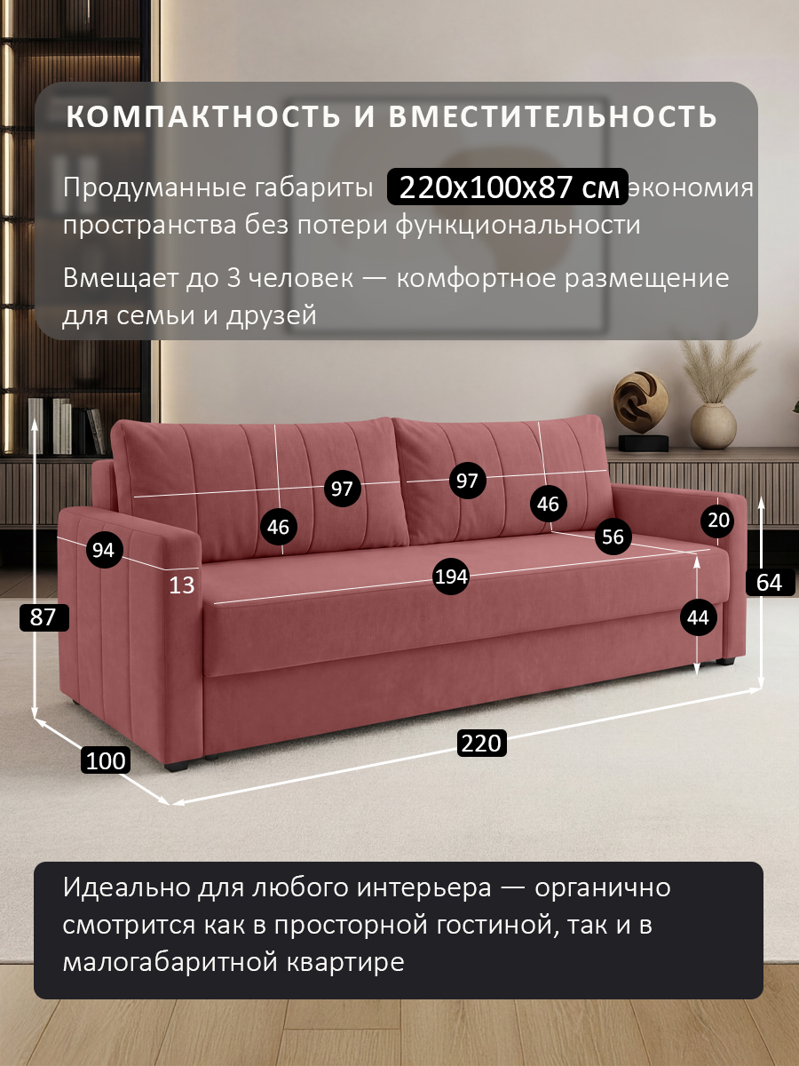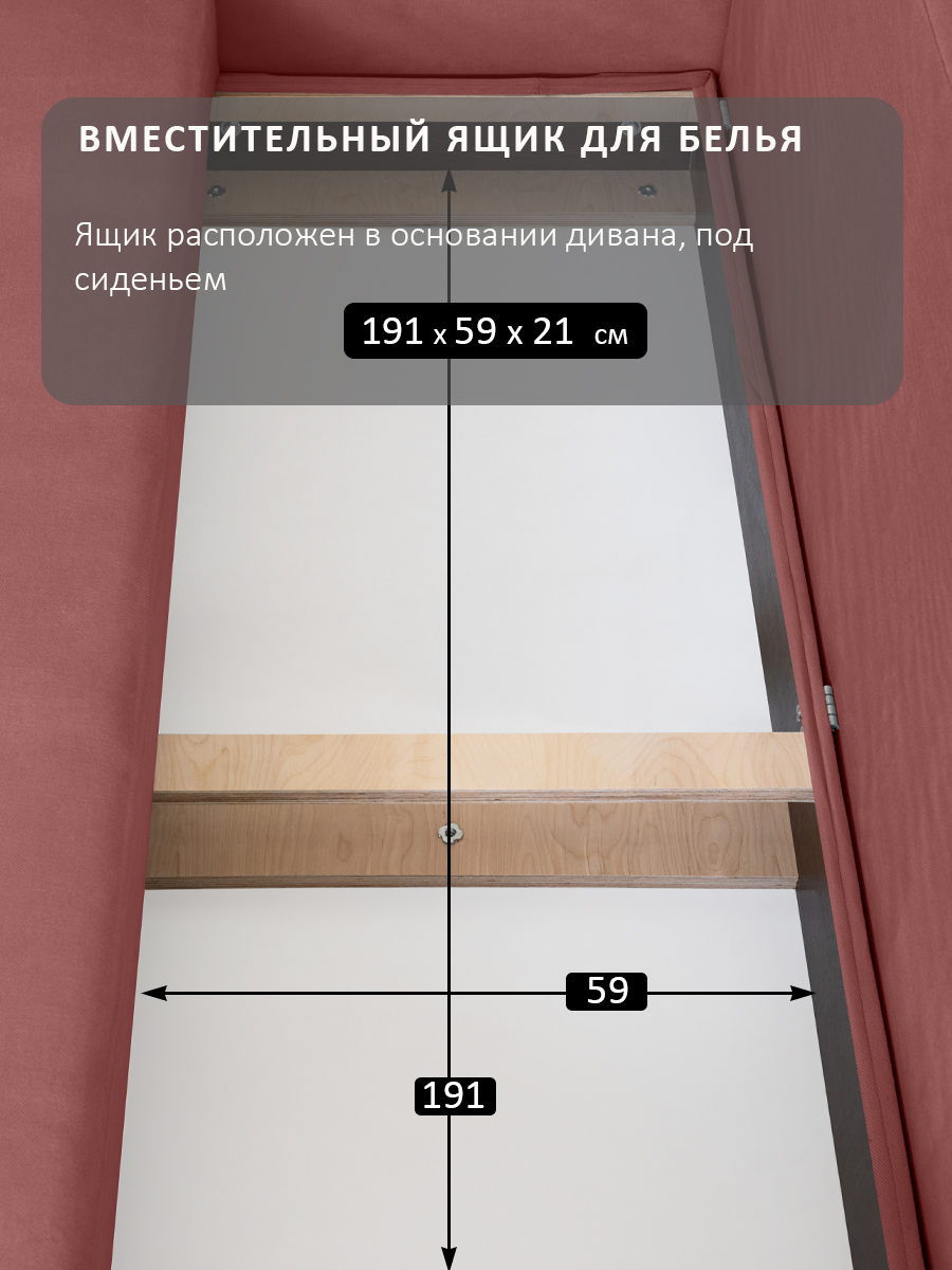 особенности: Высота подушек от сидения: 46 см, ширина каждой подушки 97 см, высота подлокотника от пола 64 см, высота подлокотника от сидения: 20 см, глубина сидения до подушки 56 см, глубина подлокотника 94 см, ширина подлокотника 13 см