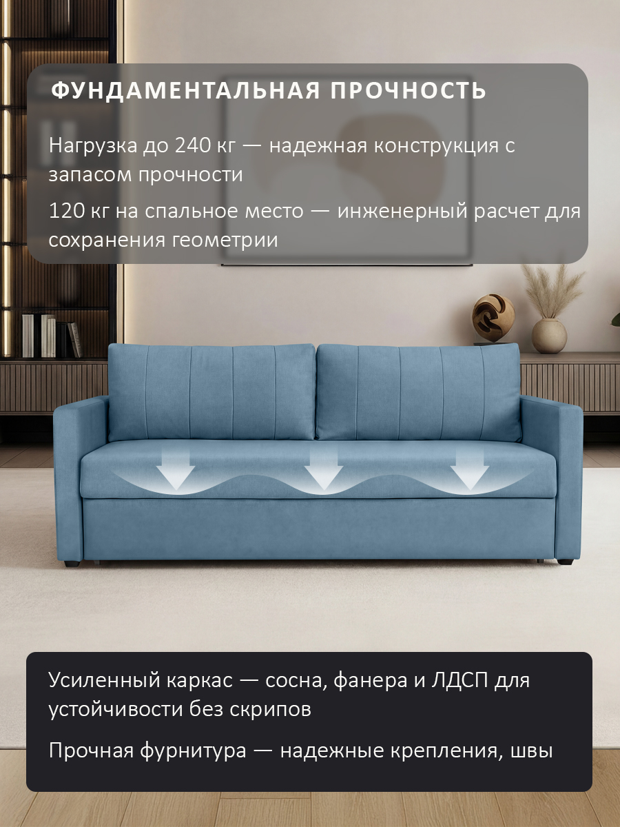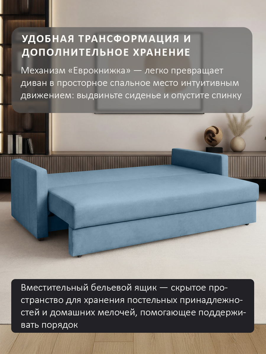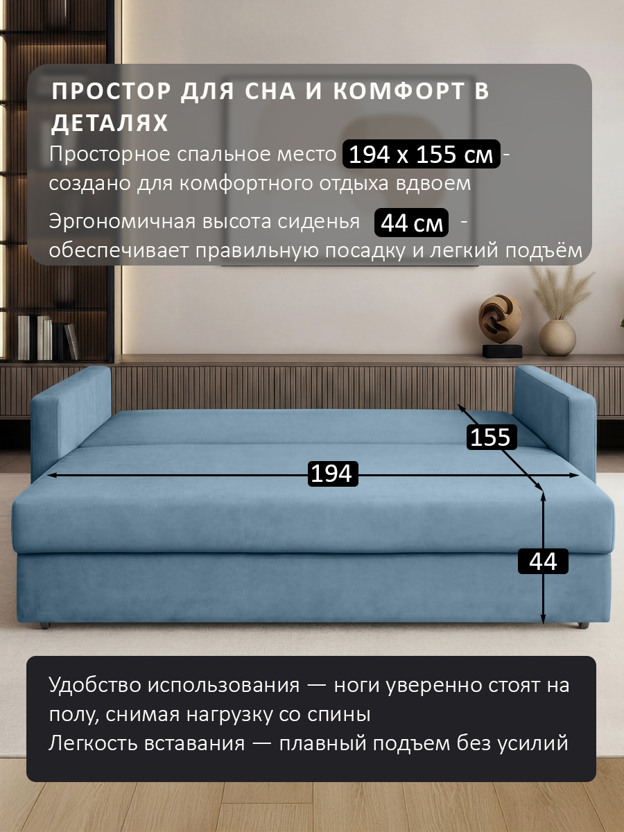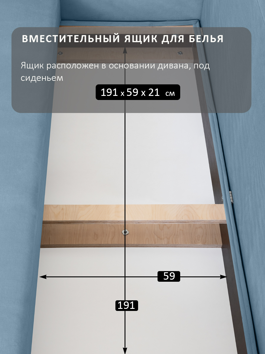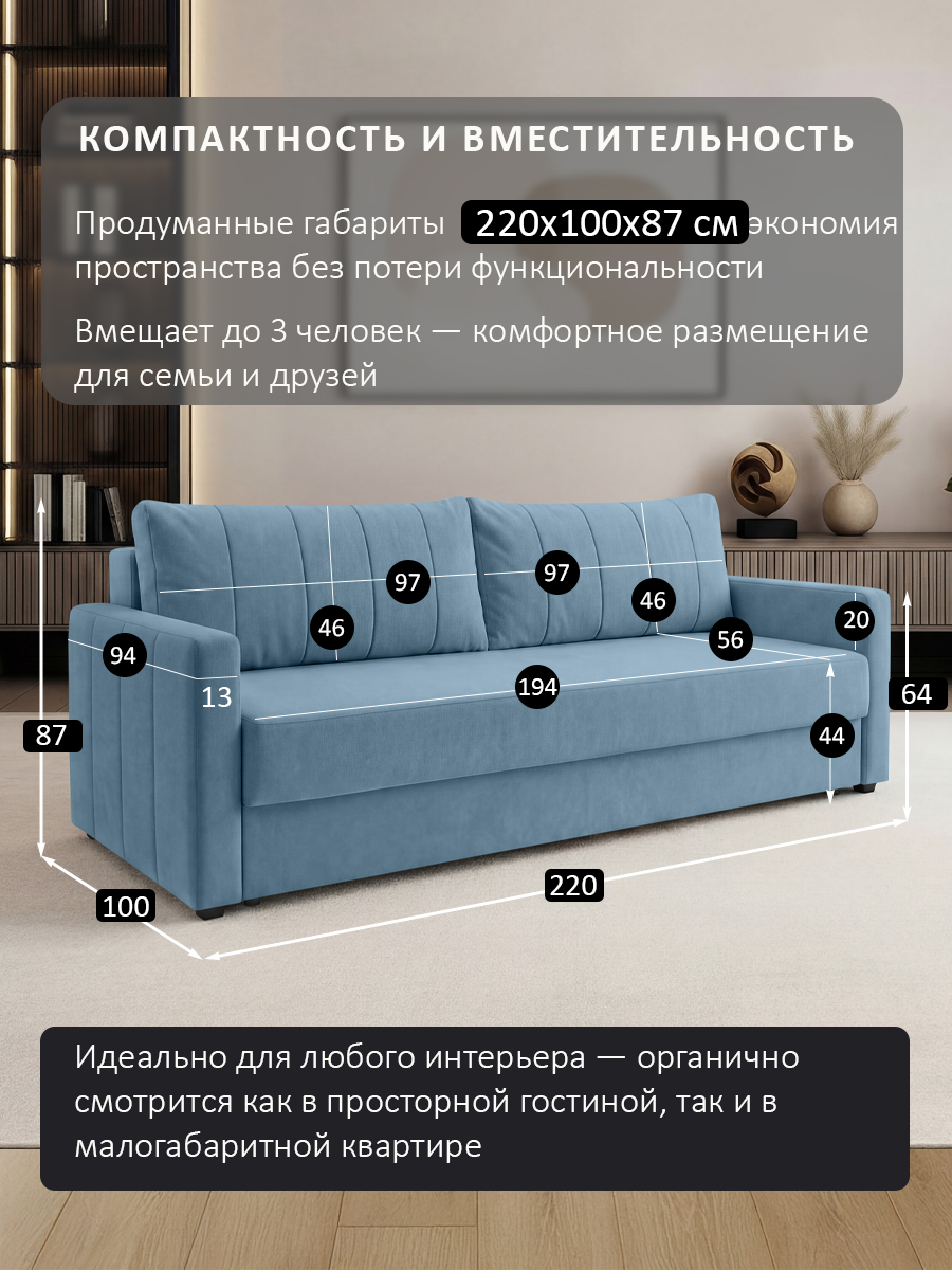 особенности: Высота подушек от сидения: 46 см, ширина каждой подушки 97 см, высота подлокотника от пола 64 см, высота подлокотника от сидения: 20 см, глубина сидения до подушки 56 см, глубина подлокотника 94 см, ширина подлокотника 13 см