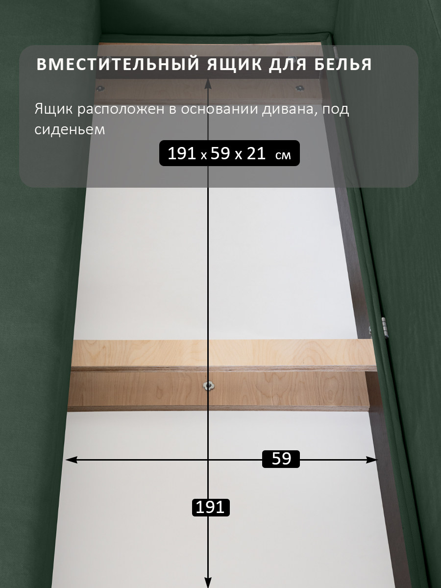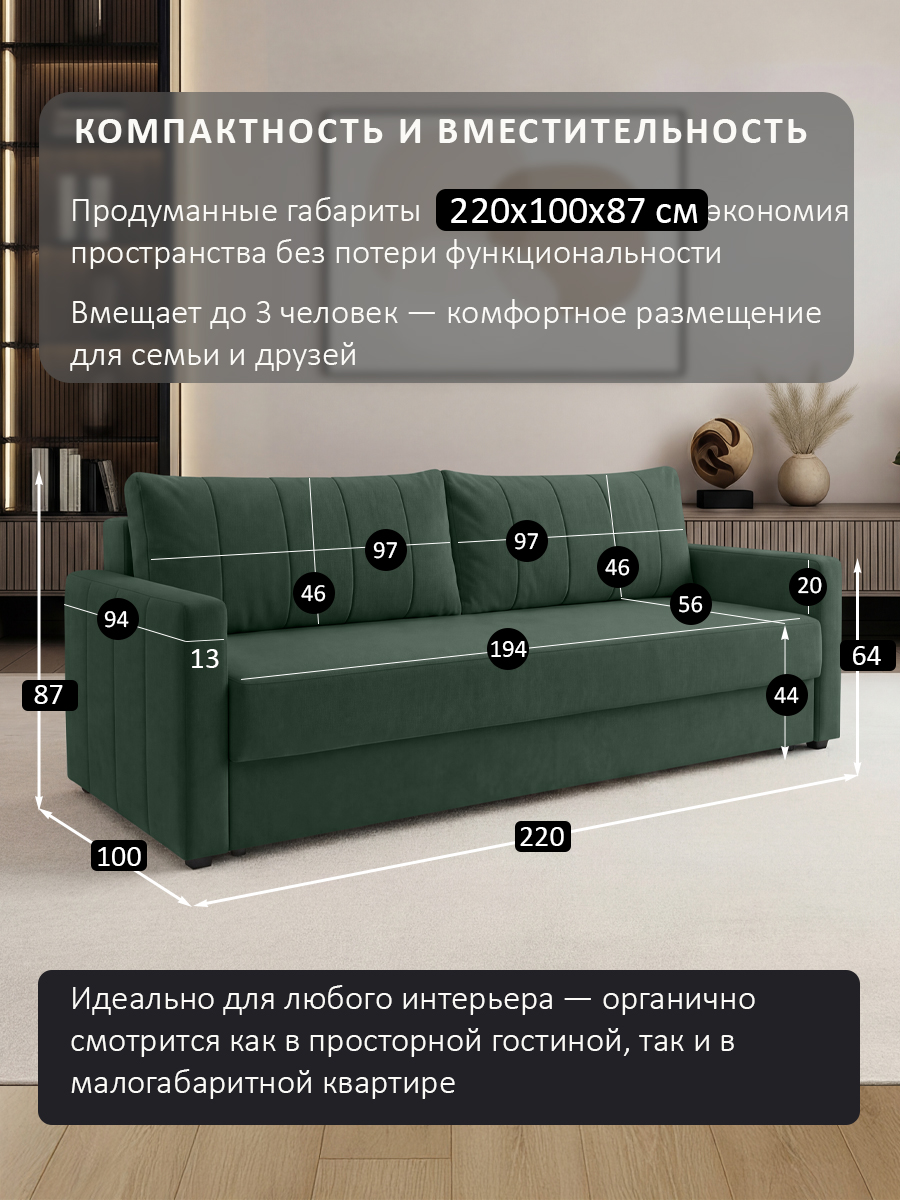 особенности: Высота подушек от сидения: 46 см, ширина каждой подушки 97 см, высота подлокотника от пола 64 см, высота подлокотника от сидения: 20 см, глубина сидения до подушки 56 см, глубина подлокотника 94 см, ширина подлокотника 13 см